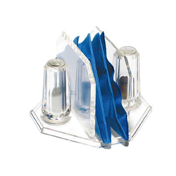 This faceted napkin holder features built-in salt and pepper shakers with small containers on each side for additional seasonings. The open center space conveniently holds napkins, keeping your table neat and organized.